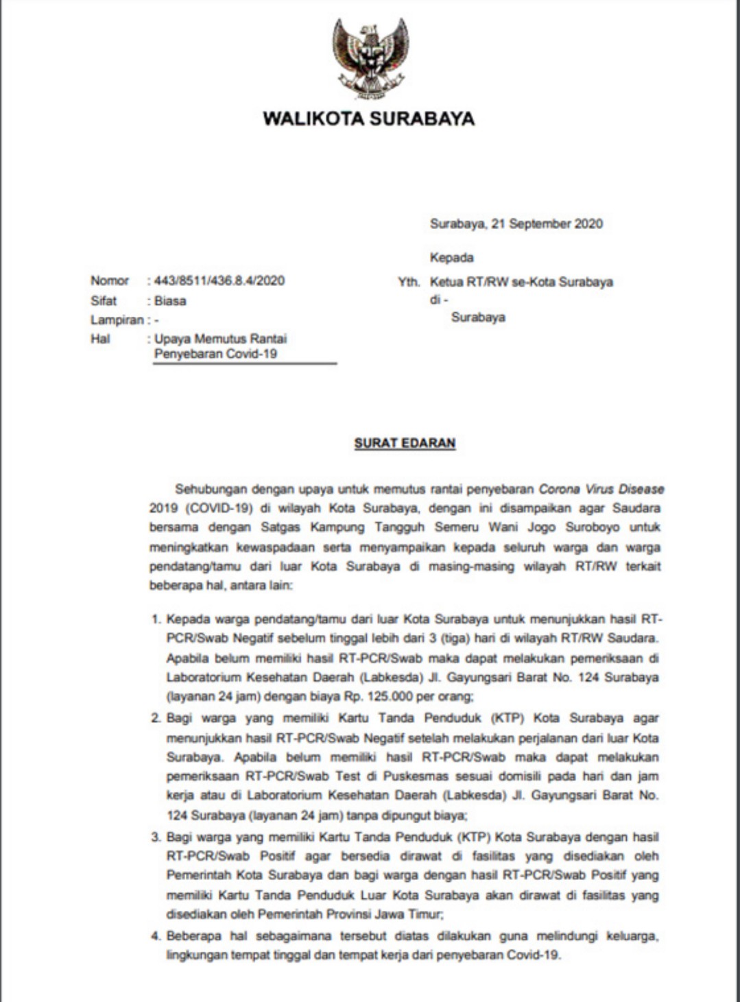 Surat edaran itu tertuang dalam surat nomor 443/8511/436.8.4/2020. Kepala Bagian Humas Pemkot Surabaya, Febriadhitya Prajatara mengatakan surat dikeluarkan tanggal 21 September 2020 dan ditujukan kepada ketua RT/RW se-Surabaya.