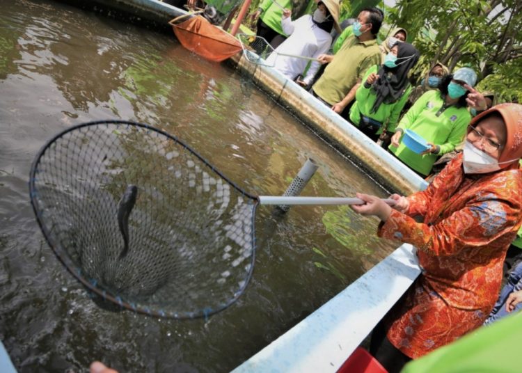 Surabayatoday.id, Surabaya – Wali Kota Surabaya Tri Rismaharini bersama jajarannya melakukan panen raya hidroponik di Mini Agro Wisata, komplek kantor Dinas Ketahanan Pangan dan Pertanian (DKPP) di Jalan Pagesangan II nomor 56 Surabaya. Panen raya itu dimulai dengan memanen sayur-sayuran seperti sawi, terong, tomat serta kangkung.