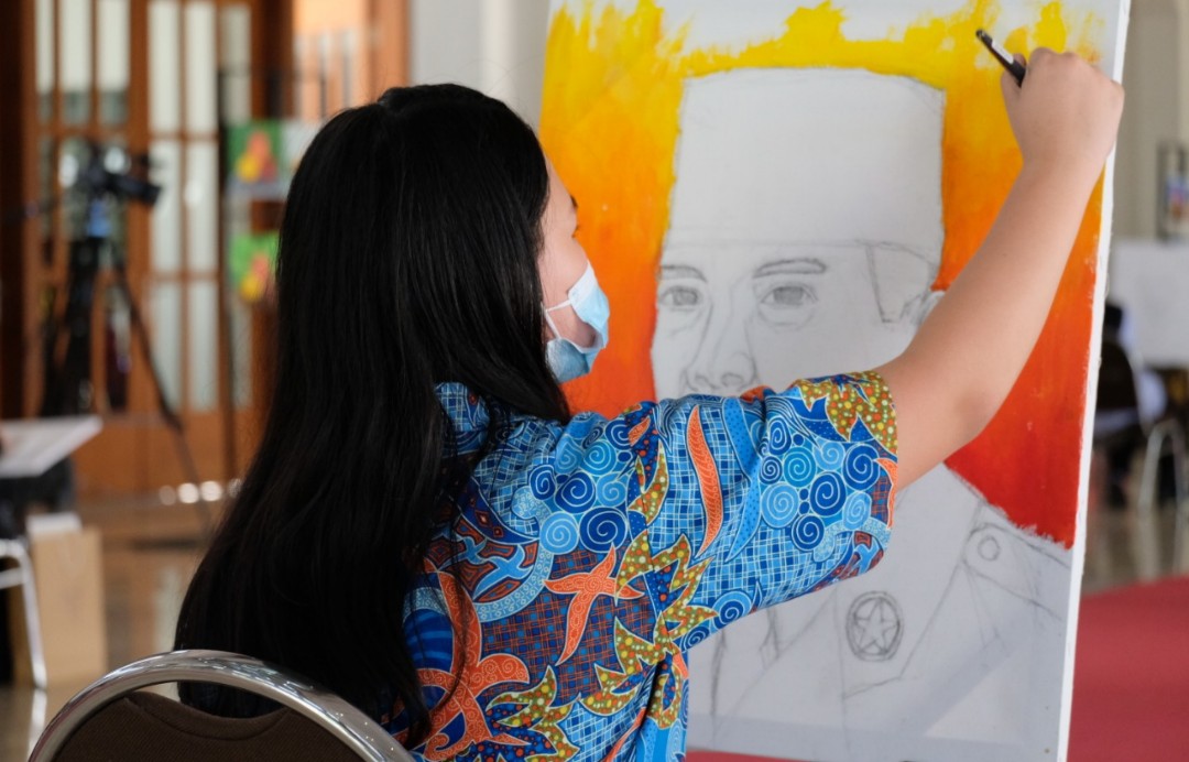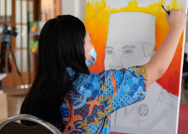 Para pelajar melukis wajah proklamator Negara Republik Indonesia (RI) Soekarno. Ada pula tokoh pendidikan Ki Hajar Dewantara serta beberapa tokoh nasional lainnya.