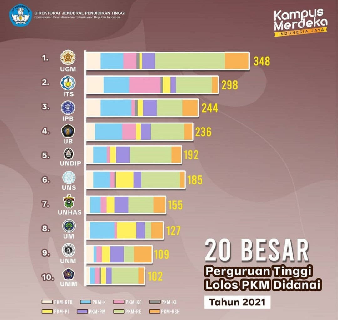 Adapun, 298 proposal yang didanai tersebut terdiri dari 48 proposal PKM Kewirausahaan (PKM-K), 81 proposal PKM Karsa Cipta (PKM-KC), 5 proposal PKM Karya Inovatif (PKM-KI), 23 proposal PKM Penerapan Iptek (PKM-PI), 15 proposal PKM Pengabdian Masyarakat (PKM-PM), 83 proposal PKM Riset Eksakta (PKM-RE), 17 Proposal PKM Riset Sosial Humaniora (PKM-RSH), dan 26 proposal Gagasan Futuristik Konstruktif (PKM GFK)