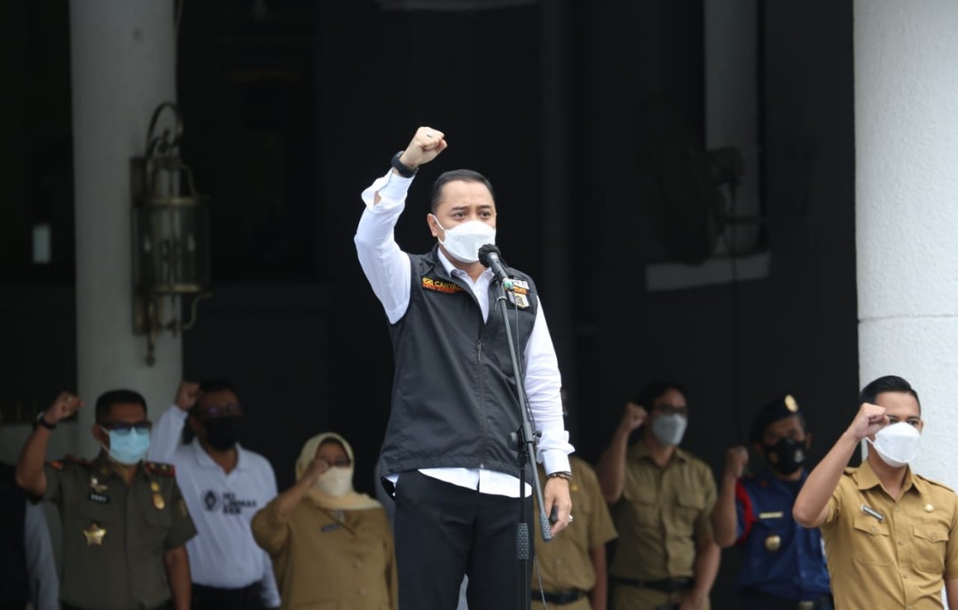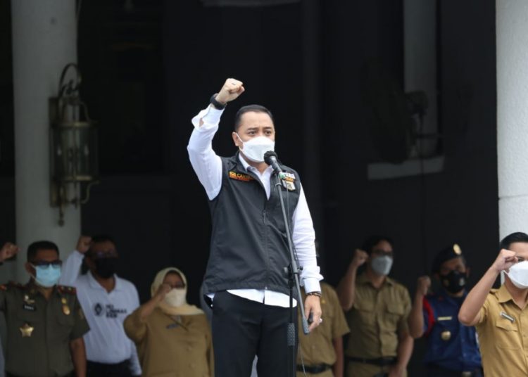 SURABAYATODAY.ID, SURABAYA – Wali Kota Surabaya Eri Cahyadi mengobarkan semangat para petugas dari TNI-Polri dan jajaran Pemerintah Kota (Pemkot) Surabaya yang akan terjun ke lapangan demi menghadapi pandemi Covid-19. Dalam apel pagi yang digelar di halaman Balai Kota Surabaya, Senin (28/6), Eri mengobarkan semangat dan juga memimpin doa bersama.