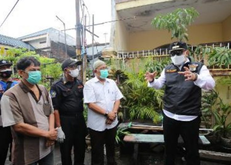 SURABAYATODAY.ID, SURABAYA – Wali Kota Surabaya Eri Cahyadi berkeliling ke kampung-kampung padat penduduk untuk mengevaluasi munculnya klaster keluarga di sejumlah perkampungan, Senin (28/6). Salah satunya di Kampung Simo Sidomulyo Kelurahan Petemon, Kecamatan Sawahan, di mana terdapat satu keluarga terkonfirmasi positif Covid-19.