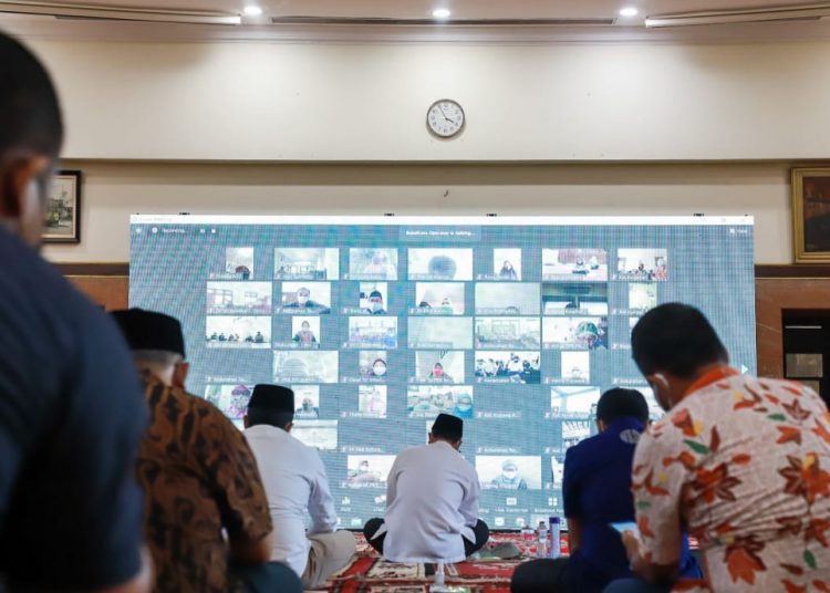 Seluruh Kepala Perangkat Daerah (PD) di lingkup pemkot tampak hadir di balai kota. Sedangkan untuk pegawai lain beserta jajaran kecamatan dan kelurahan, mengikutinya melalui daring. Mereka tampak khusyuk mengikuti rangkaian kegiatan doa bersama. Mulai dari bacaan Surat Yasin, istighotsah dan tahlil yang dipimpin ustadz Azis Muslim.