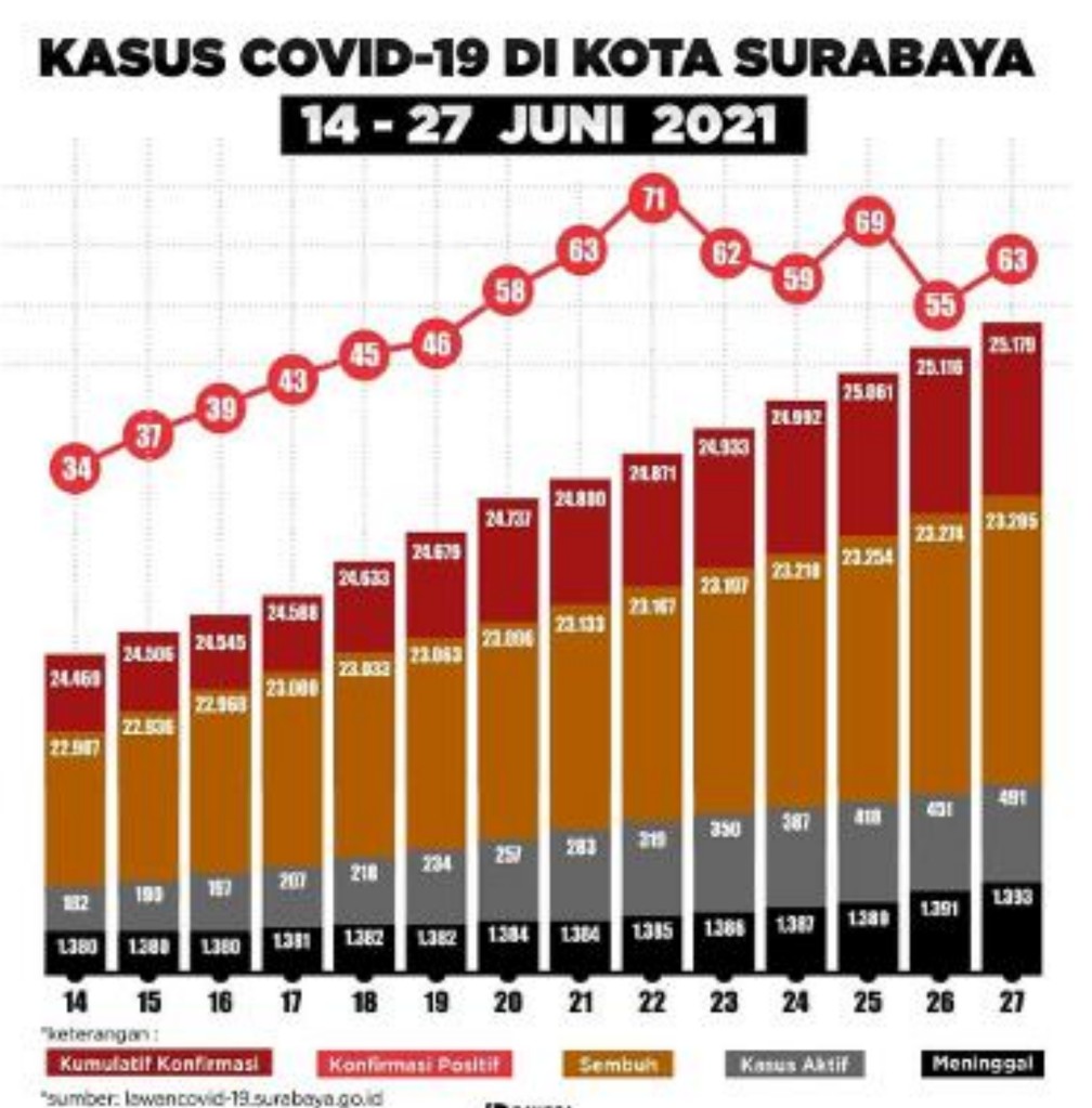 Angka harian infeksi Covid-19 di Kota Surabaya saat ini fluktuatif di kisaran 60 – 70 orang tambahan kasus harian. Paling tinggi, tanggal 22 Juni 2021 ada tambahan 70 Kasus dan berturut-turut tanggal 23 – 27 Juni 2021 ada 62 Kasus, 59 Kasus, 69 kasus, 55 kasus dan 63 kasus .
