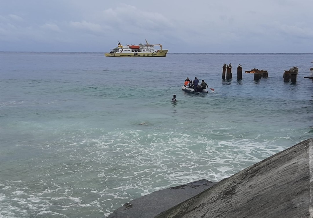 SURABAYATODAY.ID, SURABAYA – Akibat cuaca buruk karena angin kencang dan ombak yang besar di perairan Miangas, mengakibatkan kapal tol laut KM Sabuk Nusantara 95 tujuan Miangas tidak bisa sandar di dermaga pelabuhan Miangas, Senin (5/7). Akibatnya kapal tersebut lego jangkar di perairan depan dermaga.