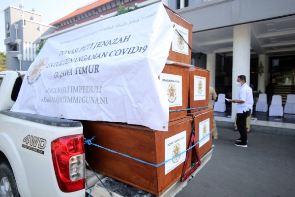 Bantuan diterima Wali Kota Surabaya Eri Cahyadi di Balai Kota Surabaya. Eri Cahyadi mengatakan, dengan bantuan yang diberikan Kagama Jawa Timur dapat membantu dan meringankan beban Pemkot Surabaya. Rencananya peti jenazah tersebut diserahkan di TPU Keputih.