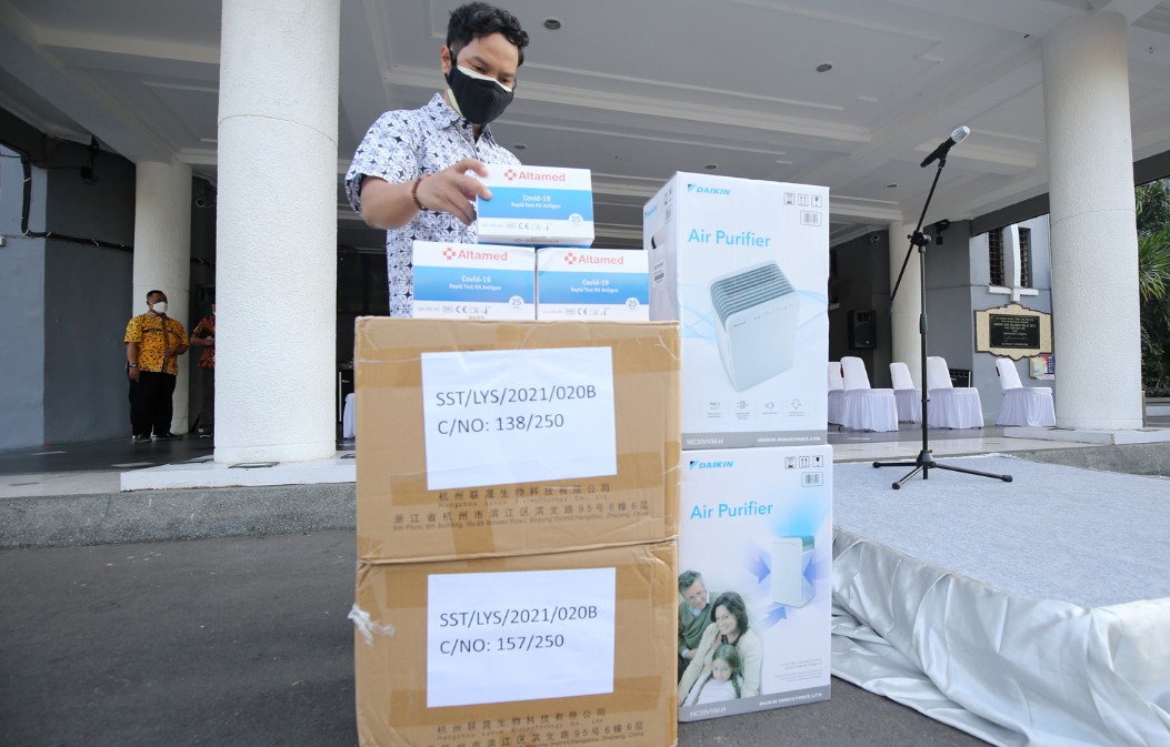 Secara simbolis, bantuan itu diterima oleh Wali Kota Surabaya Eri Cahyadi di halaman Balai Kota Surabaya, Jumat (30/7). Adapun bantuan yang diberikan oleh PT Bank Jatim Tbk, terdiri dari 5.000 unit alat rapid test antigen dan dua unit hepa Filter. Sementara Kantor Konsultan Pajak Tribus Maxima Solution, menyerahkan bantuan berupa 50 hazmat, 50 kantong jenazah, dan 40 kotak masker medis.