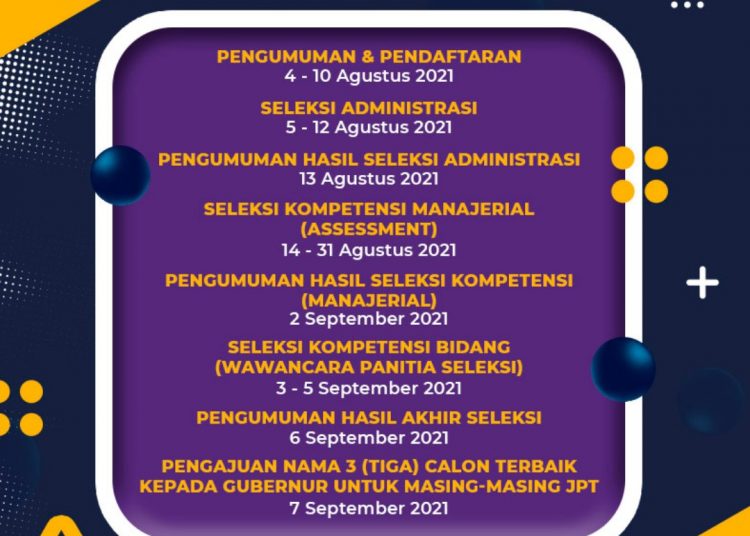 Sedangkan beberapa tahapannya yakni seleksi administrasi, pengumuman seleksi administrasi, assesment kompetensi manajerial (oleh tim assessor atau Lembaga Assessment Center yang ditunjuk), dan pengumuman hasil assesment kompetensi manajerial.