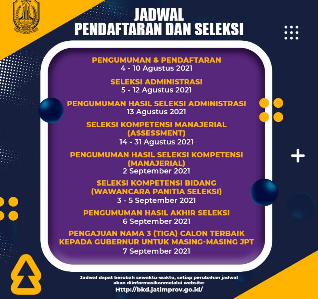 Baik pengumuman dan lampiran yang dibutuhkan bisa di download dari website tersebut. Kemudian, di tahap akhir yakni pengajuan nama 3 terbaik kepada gubernur pada 7 September 2021.