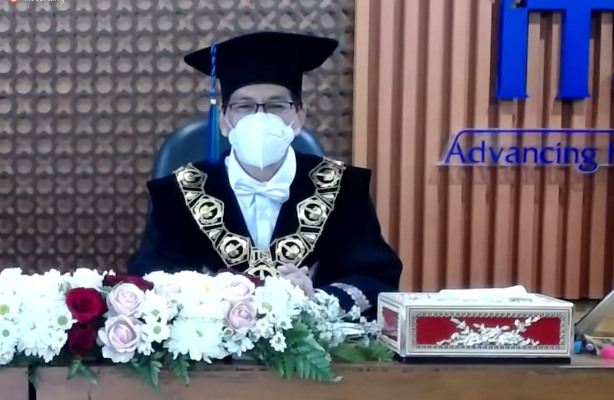 Rektor ITS Prof Dr Ir Mochamad Ashari MEng saat memberikan sambutan pada prosesi Pengukuhan Mahasiswa Baru ITS 2021.