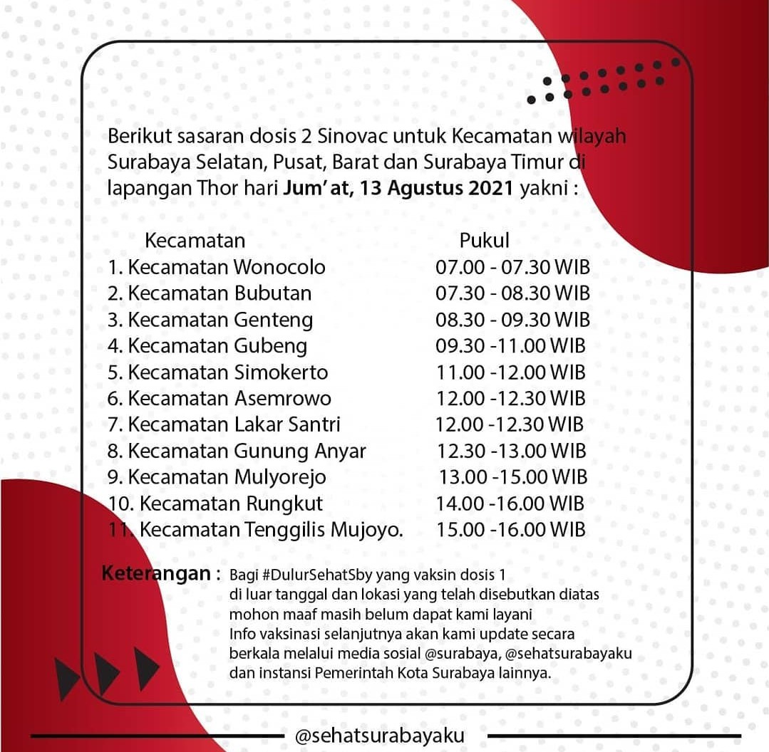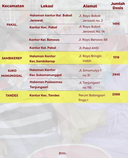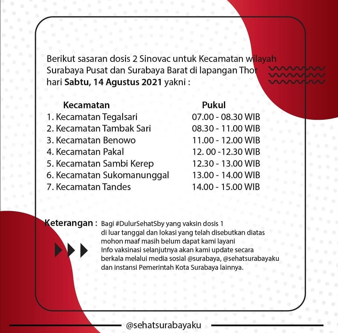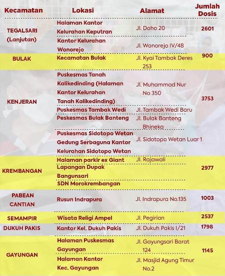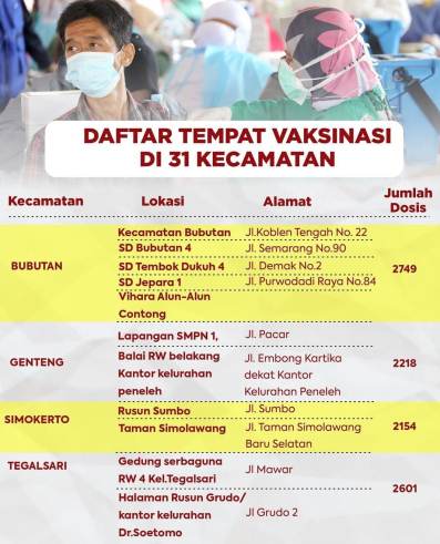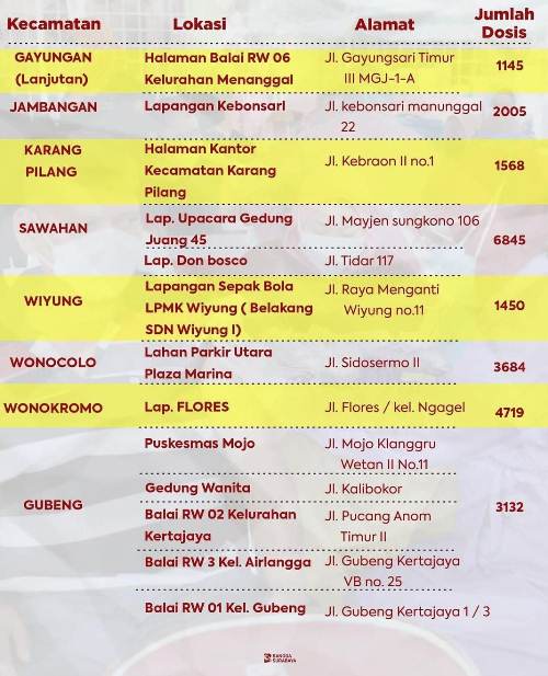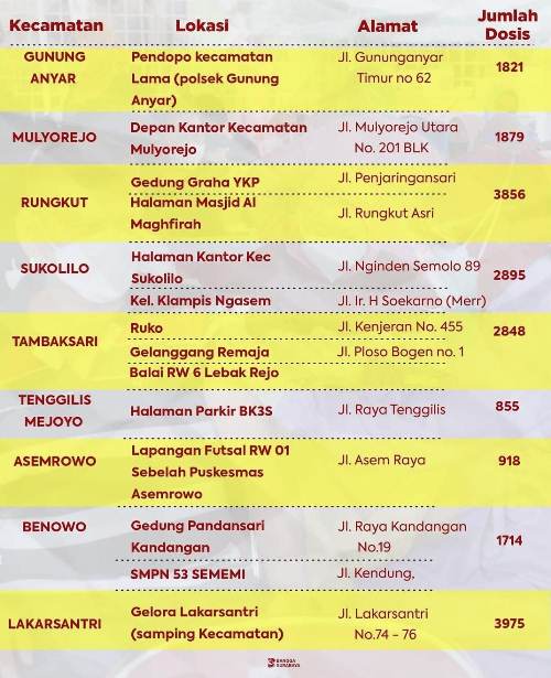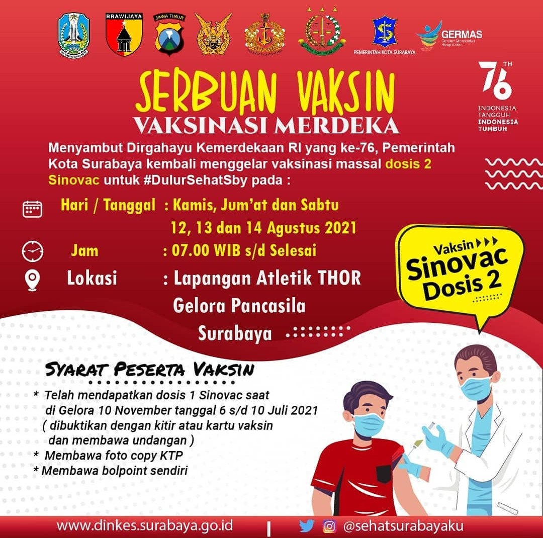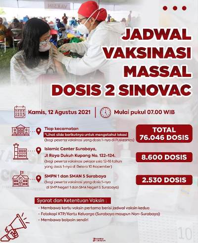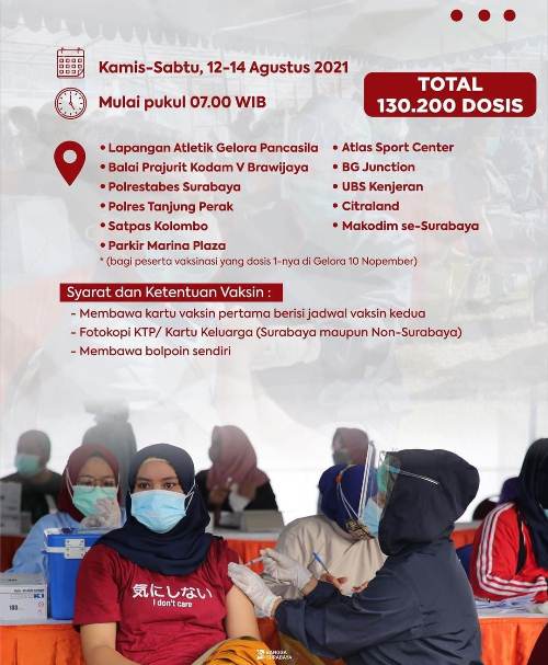 Bersama TNI dan Polri, vaksinasi serentak ini akan dilaksanakan selama tiga hari sampai 14 Agustus 2021. Sedangkan lokasi kegiatan disebar di 31 wilayah kecamatan Surabaya.