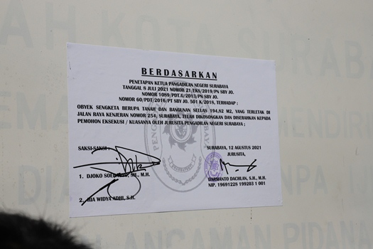 Eksekusi ini berdasarkan penetapan ketua PN Surabaya tanggal 8 Juli 2021, Nomor 21/EKS/2019/PN SBY JO. Nomor 1089/PDT.G/2013/PN SBY JO. Nomor 60/PDT/2016/PT SBY JO. 501 K/2018.