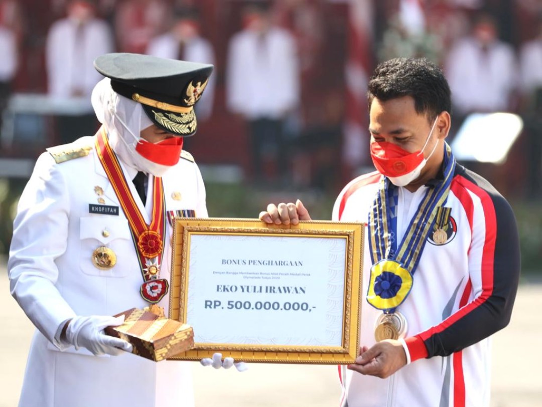 Mewakili Pemprov Jatim, Gubernur Khofifah dan Wagub Emil memberikan bonus senilai Rp 500 juta kepada Eko Yuli Irawan karena telah meraih medali perak di Olimpiade Tokyo 2020. Eko Yuli Irawan merupakan lifter asal Jatim dan tergabung dalam Puslatda Jatim.
