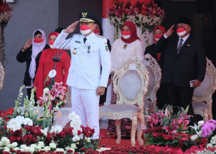 SURABAYATODAY.ID, SURABAYA – Pemkot Surabaya menggelar upacara Hari Ulang Tahun (HUT) ke-76 Kemerdekaan Republik Indonesia (RI) di Balai Kota Surabaya, Selasa (17/8). Upacara berlangsung terbatas dengan dihadiri Forum Komunikasi Pimpinan Daerah (Forkopimda) Kota Surabaya.