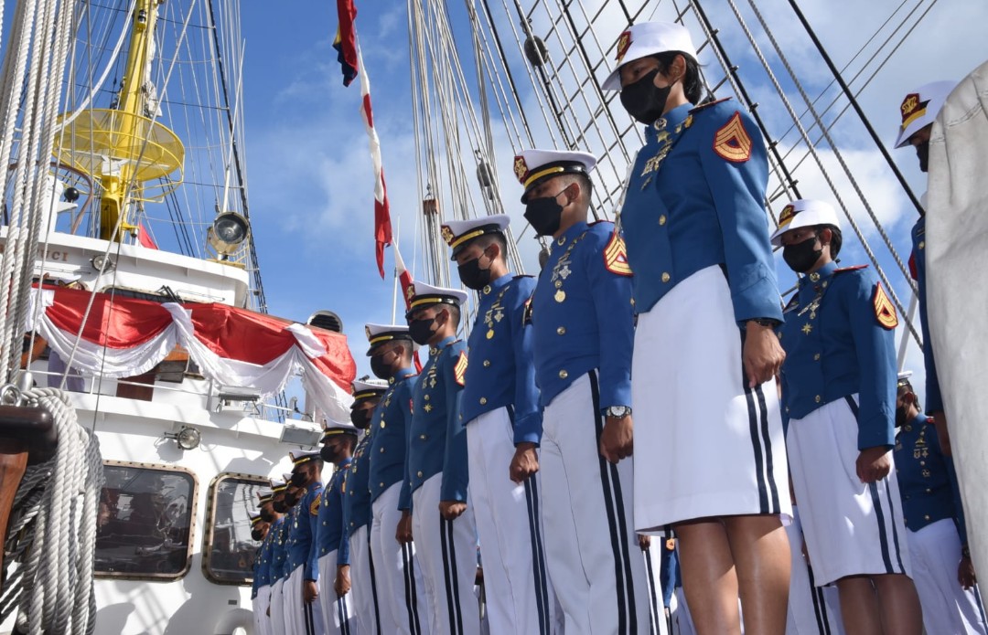 Tampak gagah dan rapi berbaris di atas geladak tengah KRI Bima Suci, membuat formasi upacara yang terdiri dari peleton gabungan Perwira Menengah (Pamen), Perwira Pertama (Pama), Taruna AAL Angkatan ke-68 dan Peleton Gabungan Bintara-Tamtama dari Satlat dan Satgas KJK 2021 dengan tetap melaksanakan protokol kesehatan.