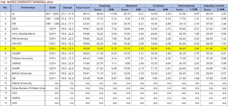 Kedua indikator penilaian yang mengalami kenaikan tersebut adalah bidang Research dan International Outlook. Di pemeringkatan kali ini, ITS masuk dalam delapan besar perguruan tinggi terbaik di Indonesia dengan perolehan skor 19,0, dalam rentang rata-rata 10,6 – 22,3. Secara keseluruhan, ITS menempati peringkat 1.200+ dunia dari 1.600 lebih perguruan tinggi yang berpartisipasi dan masuk dalam pemeringkatan.