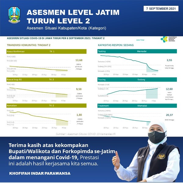 Tren kasus positif Jatim mengalami penurunan dari 115,7 menjadi 13,68 kasus per 100 ribu penduduk/minggu. Tren rawat inap mengalami penurunan dari 36,82 menjadi 9,58 kasus per 100 ribu penduduk/minggu, tren kematian turun dari 6,27 menjadi 1,8 kematian per 100 ribu penduduk/minggu.