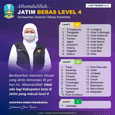 “Berdasarkan asesmen situasi yang dirilis Kemenkes RI, alhamdulillah tidak ada lagi kabupaten/kota di Jatim yang masuk pada Level 4. Terima kasih sinergi dan kekompakan dari semua pihak,” ujar Khofifah.