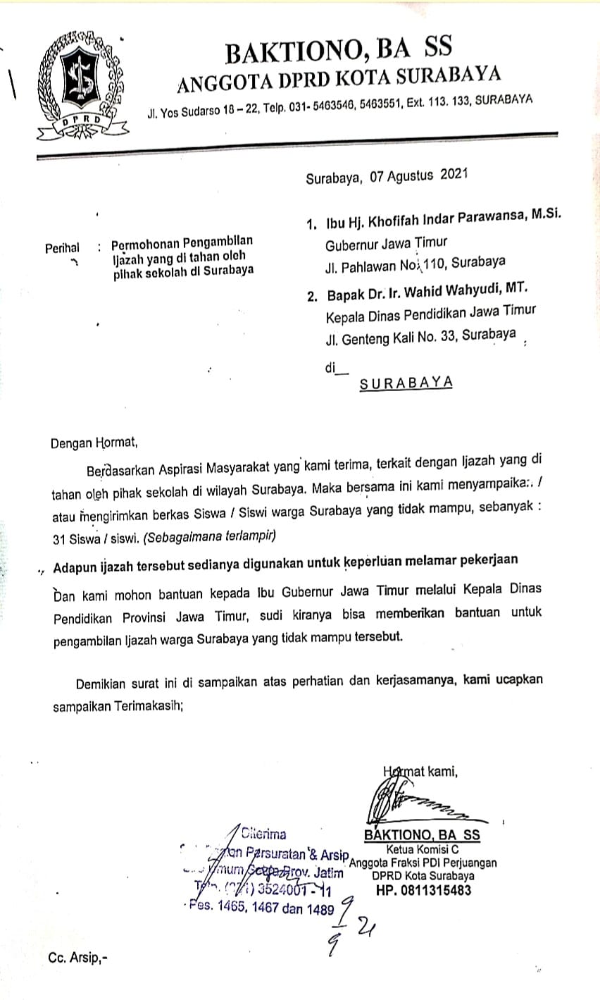 “Saya berharap gubernur Jatim memberikan bantuan untuk pengambilan ijazah warga Surabaya yang tidak mampu tersebut,” terangnya.