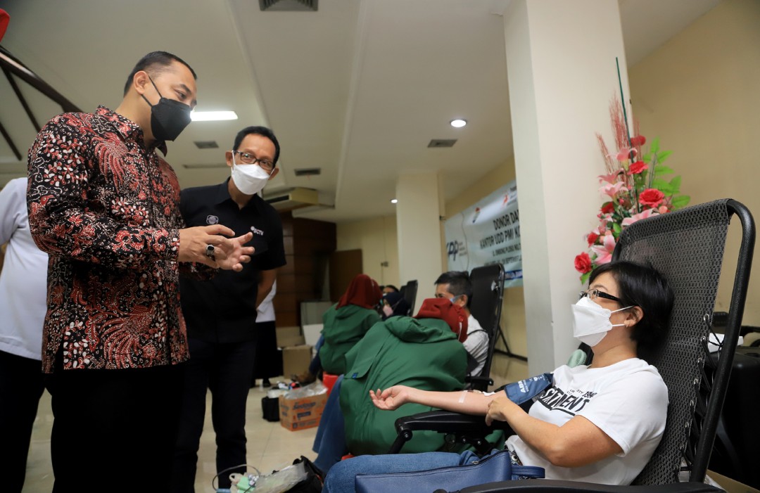 Wali Kota Surabaya Eri Cahyadi meninjau proses donor darah di PMI Surabaya.