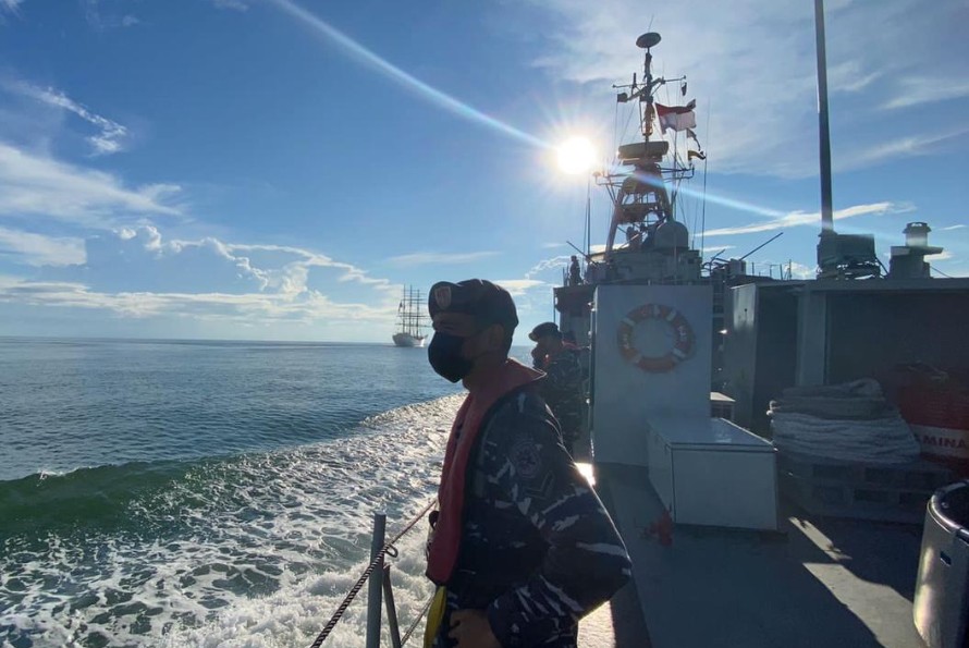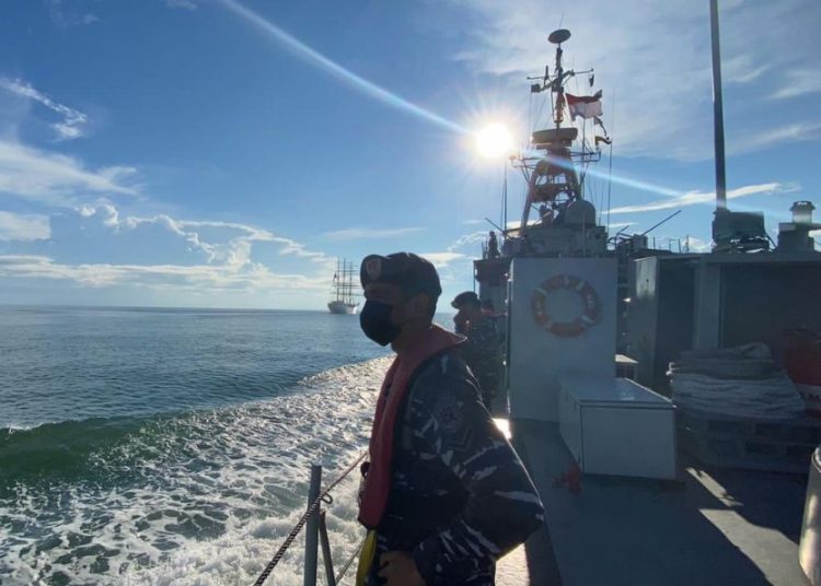 Komandan Guspurla Koarmada II Laksma TNI Hersan selaku Dansatgasla Opsgab Garda Paus 21 turut serta dalam giat penyambutan KRI Bima Suci dengan onboard di KRI Layang-635.