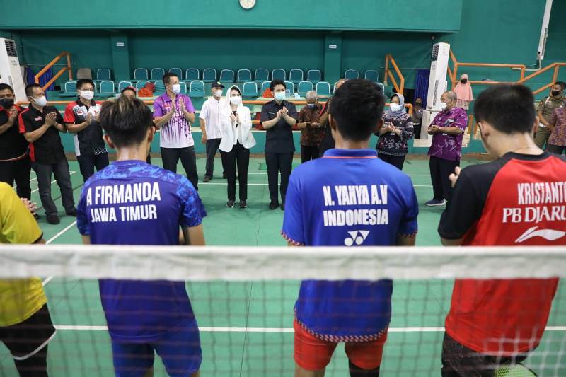SURABAYATODAY.ID, SURABAYA – Ada suasana yang berbeda bagi para atlet bulutangkis yang akan berlaga di ajang Pekan Olahraga Nasional (PON) XX/2021 Papua. Saat mengadakan sesi latihan di GOR Sudirman, Jl. Ir. Soekarno Surabaya, Senin (27/9) malam, tiba-tiba mereka disambangi Wakil Gubernur Jatim Emil Elestianto Dardak bersama Ketua Persatuan Wanita Olahraga Seluruh Indonesia (Perwosi) Jatim Arumi Bachsin.