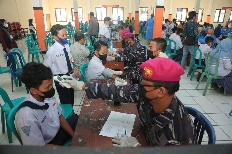 Pangkoarmada II Laksda TNI Dr. Iwan Isnurwanto bersama dengan Bupati Pasuruan HM Irsyad Yusuf didampingi Dansatgas serbuan vaksinasi Pasuruan Kolonel Laut (P) Ludfy, serta pejabat dari Pemkab Pasuruan meninjau langsung kegiatan ini. “Serbuan vaksinasi ini adalah perintah langsung Panglima TNI melalui Kepala Staf Angkatan Laut (Kasal) Laksamana TNI Yudo Margono kepada seluruh jajaran TNI dari Sabang hingga Merauke untuk mendukung program pemerintah dalam penanganan Covid-19, juga demi cepatnya pemulihan ekonomi nasional,” papar Pangkoarmada II.