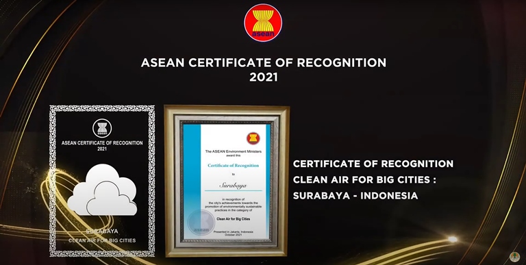 Penghargaan di bidang lingkungan ini juga diterima dua hari kemudian. Pada 21 Oktober 2021, Kota Surabaya berhasil meraih penghargaan sebagai kota besar dengan udara terbersih se-Asia Tenggara atau ASEAN. Penghargaan yang pertama diraih sepanjang sejarah itu diterima langsung oleh Wali Kota Eri Cahyadi dalam acara yang bertajuk “The 5 ASEAN ESC Award and the 4 Certificate of Recognition” yang digelar di Jakarta.