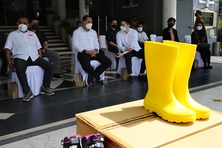 SURABAYATODAY.ID, SURABAYA – Pemkot Surabaya menerima bantuan berupa pasang sepatu dari CV Sinar Terang Sejahtera dan PT Rajapaksi Adyaperkasa di Balai Kota Surabaya, Selasa (14/12/2021). Bantuan itu diterima Wali Kota Surabaya Eri Cahyadi didampingi Wakil Wali Kota Surabaya Armuji.