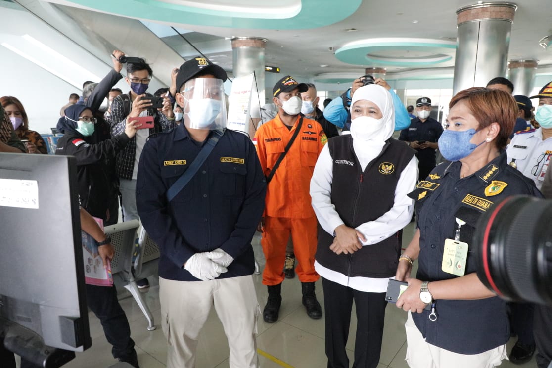 Gubernur Jatim Khofifah Indar Parawansa saat meninjau Kapal Motor Penumpang (KMP) Mila Utama yang bersandar di Dermaga Jamrud Utara Terminal Gapura Surya Nusantara (GSN) Surabaya.