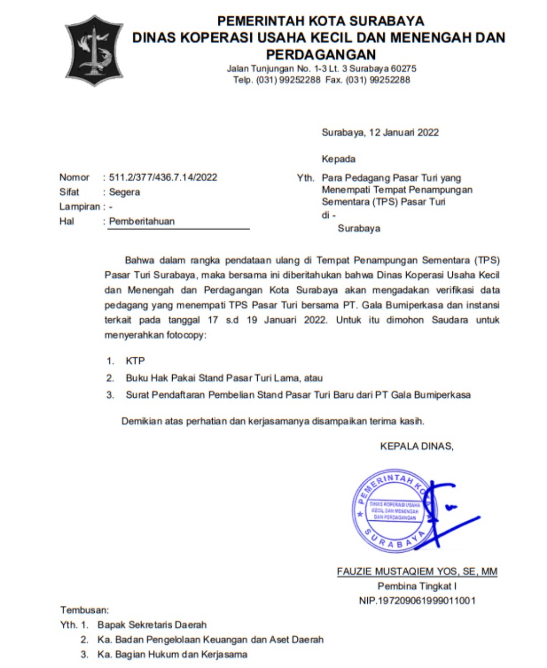 Di dalam surat edaran dari Dinkopum Kota Surabaya pada 12 Januari 2022 tertulis, bahwa tanggal 17 hingga 19 Januari 2022, Dinkopum bersama PT Gala Bumi Perkasa dan instansi terkait akan melakukan verifikasi data pedagang yang menempati TPS Pasar Turi.