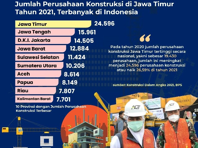 SURABAYATODAY.ID, SURABAYA – Provinsi Jawa Timur menjadi provinsi yang memiliki perusahaan konstruksi terbanyak di Indonesia selama periode 2020-2021. Dalam rilis resmi Badan Pusat Statistik (BPS) pada Desember 2021 lalu, yakni Konstruksi Dalam Angka 2021, Jatim berhasil mengungguli 33 provinsi lainnya dengan total 24.596 perusahaan konstruksi.