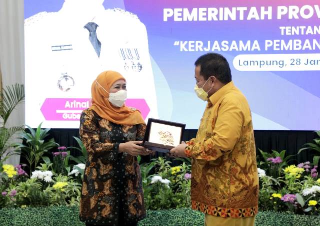 SURABAYATODAY.ID, LAMPUNG – Pemerintah Provinsi Jawa Timur Memorandum of Understanding (MoU) dengan Pemerintah Provinsi Lampung. MoU berisi kerja sama di bidang pertanian, tanaman pangan dan hortikultura, peternakan dan kesehatan hewan, perkebunan, perindustrian dan perdagangan tersebut ditandatangani Gubernur Jawa Timur Khofifah Indar Parawansa dan Gubernur Lampung Arinal Djunaidi, di Mahan Agung Lampung, Jumat (28/1) lalu.