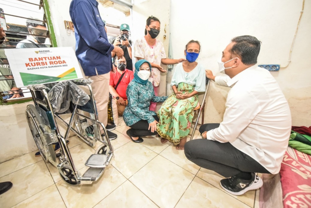 Wali Kota Surabaya Eri Cahyadi, beserta Ketua Tim Penggerak (TP) PKK Kota Surabaya, Rini Indriyani dan Pengurus Baznas, terjun langsung membagikan kursi roda kepada sejumlah warga penerima di Kampung Keputran Kejambon dan Panjunan, Kelurahan Embong Kaliasin, Kecamatan Genteng Surabaya.