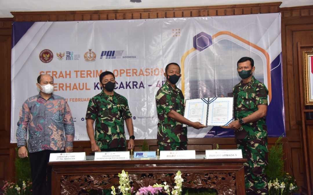 Serah terima operasional overhaul KRI Cakra-401 dilaksanakan dari PT PAL kepada Dirjen Kuathan Kemhan RI, selanjutnya dari Dirjen Kuathan Kemhan RI diserahkan kepada TNI AL dalam hal ini Aslog Kasal, dan terakhir dari Aslog Kasal diserahkan kepada Pangkoarmada II sebagai user kapal selam buatan Jerman tersebut. Kemudian kepada Aslog Kasal dan Pangkoarmada II, Dirut PT PAL Indonesia memberikan cenderamata berupa maket kapal selam.
