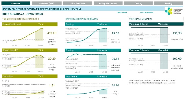 SURABAYATODAY.ID, SURABAYA – Situasi Covid-19 di Kota Surabaya berada pada Level 4 berdasarkan hasil asesmen Kementerian Kesehatan (Kemenkes) RI per tanggal 20 Februari 2022. Namun dalam Instruksi Menteri Dalam Negeri (Inmendagri) No 12/2022 tentang PPKM Darurat yang menjadi pedoman aktivitas masyarakat, Kota Pahlawan masih berstatus Level 3.