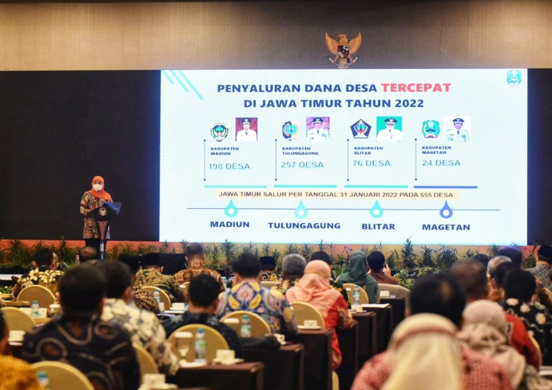 Lebih lanjut gubernur perempuan pertama di Jatim tersebut mengatakan, tahun 2021 Pemprov Jatim telah menyalurkan 99,92 persen DD ke 7.721 desa. Total anggaran yang disalurkan sebesar Rp 7,653 triliun dari total alokasi sebesar Rp 7,659 triliun. Terdapat tiga desa yang belum tersalurkan DD karena dua diantaranya ialah desa di Sidoarjo yang terdampak lumpur Lapindo. Satu desa lainnya ialah Desa Dooro, Kecamatan Cerme, Gresik karena kepala desa menghadapi permasalahan hukum.