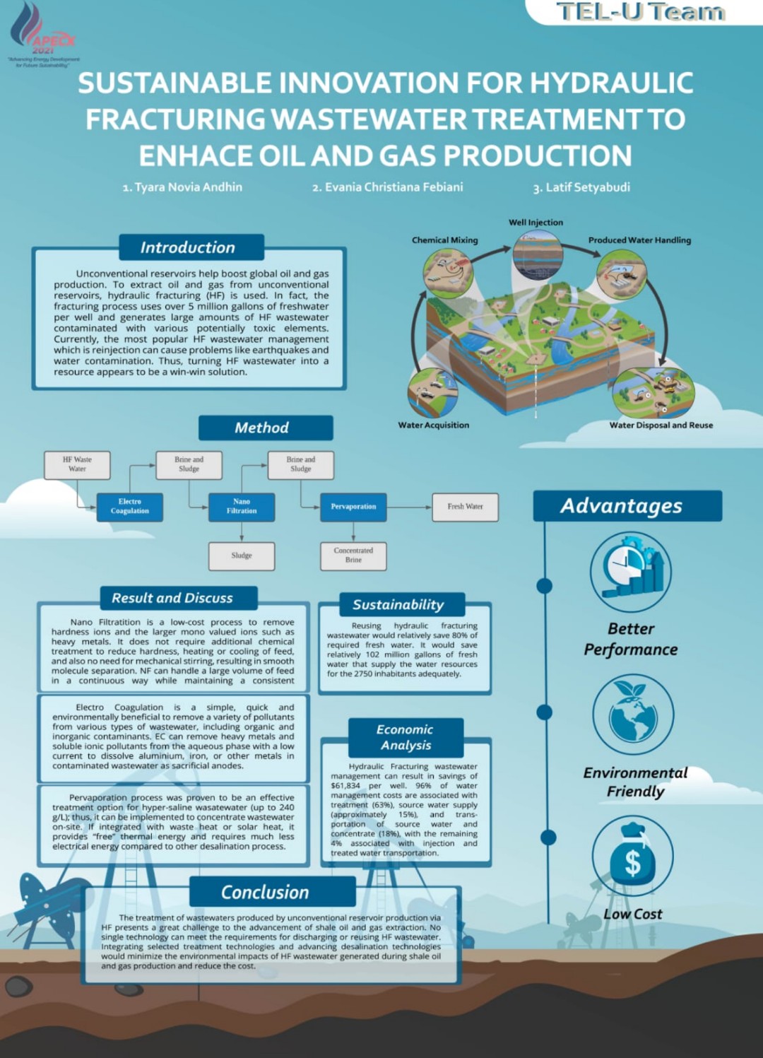 Mengangkat karya tulis berjudul Sustainable Innovation for Hydraulic Fracturing Wastewater Treatment to Enhace Oil and Gas Production, tim perwakilan ITS ini juga telah berhasil meraih gelar first runner up dan poster terfavorit dalam kompetisi APECX 2021 yang digelar Universitas Gadjah Mada (UGM), tahun lalu.