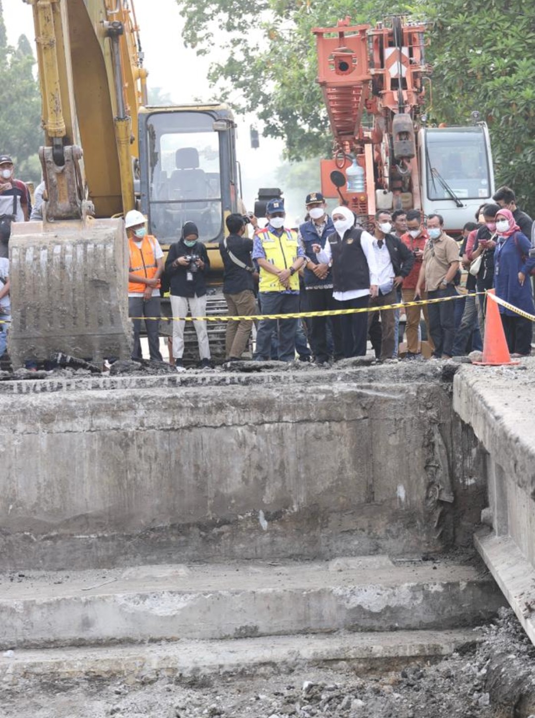 Gubernur Jawa Timur Khofifah Indar Parawansa saat meninjau revitalisasi Jembatan Ngaglik Lamongan yang ambles.