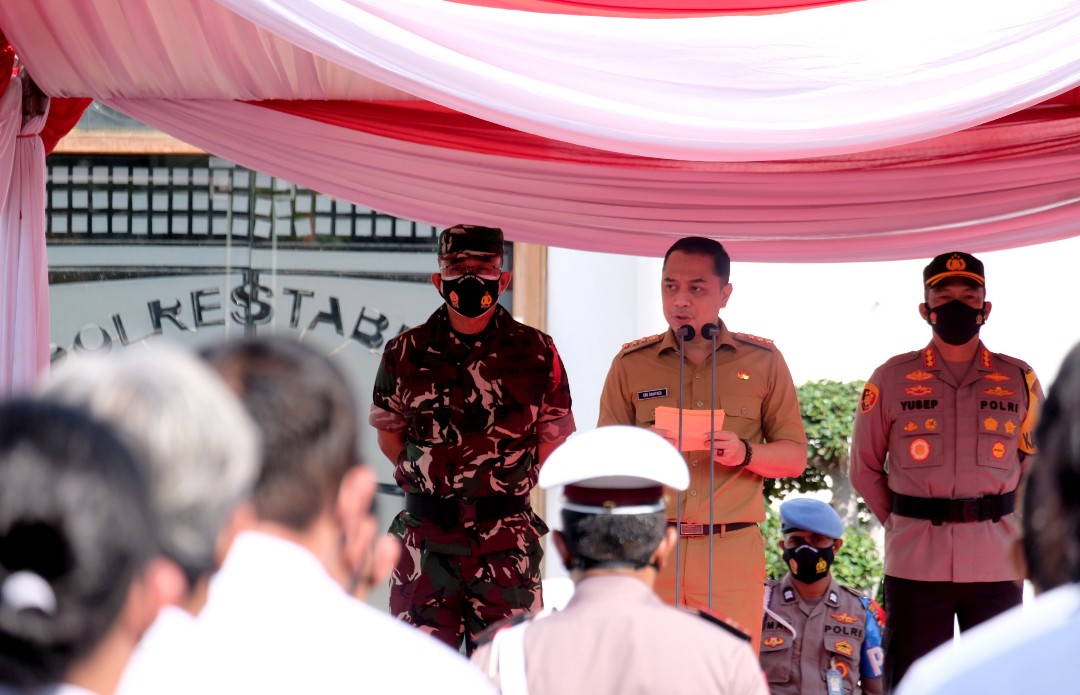 Wali Kota Surabaya Eri Cahyadi saat memimpin Apel Gelar Pasukan Operasi Kepolisian Terpusat di Mapolrestabes Surabaya.