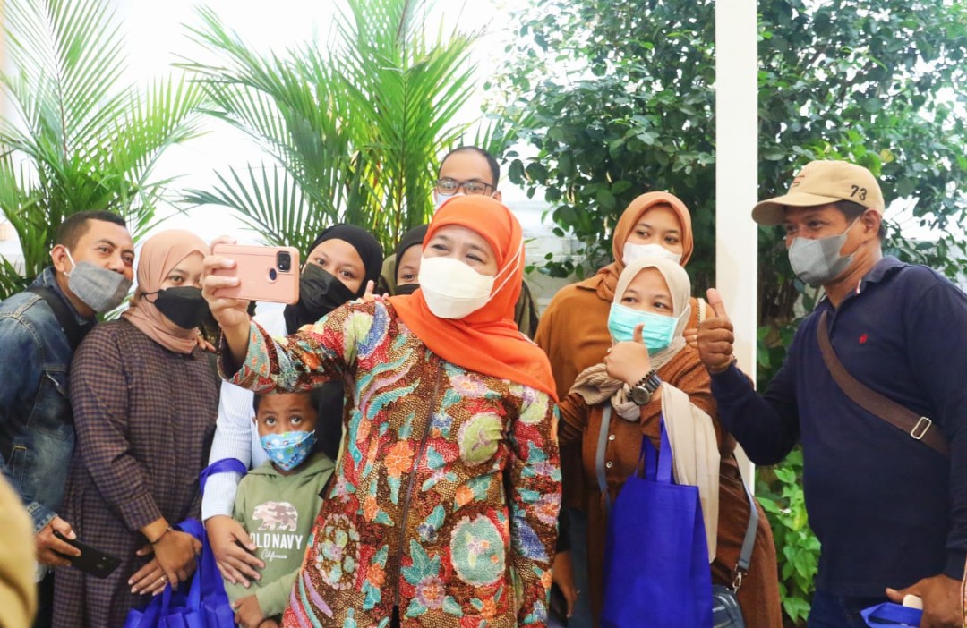 Tak hanya menyapa, Gubernur Khofifah bahkan tanpa ragu-ragu memegang sendiri kamera pengunjung yang menyempatkan diri mengunjungi Grahadi untuk melakukan selfie alias swafoto.