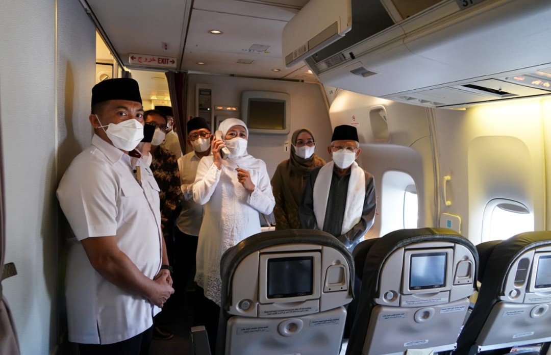 Gubernur Jawa Timur Khofifah Indar Parawansa mendampingi Wakil Presiden RI Ma'ruf Amin melepas 449 jemaah haji kloter pertama asal Jawa Timur.