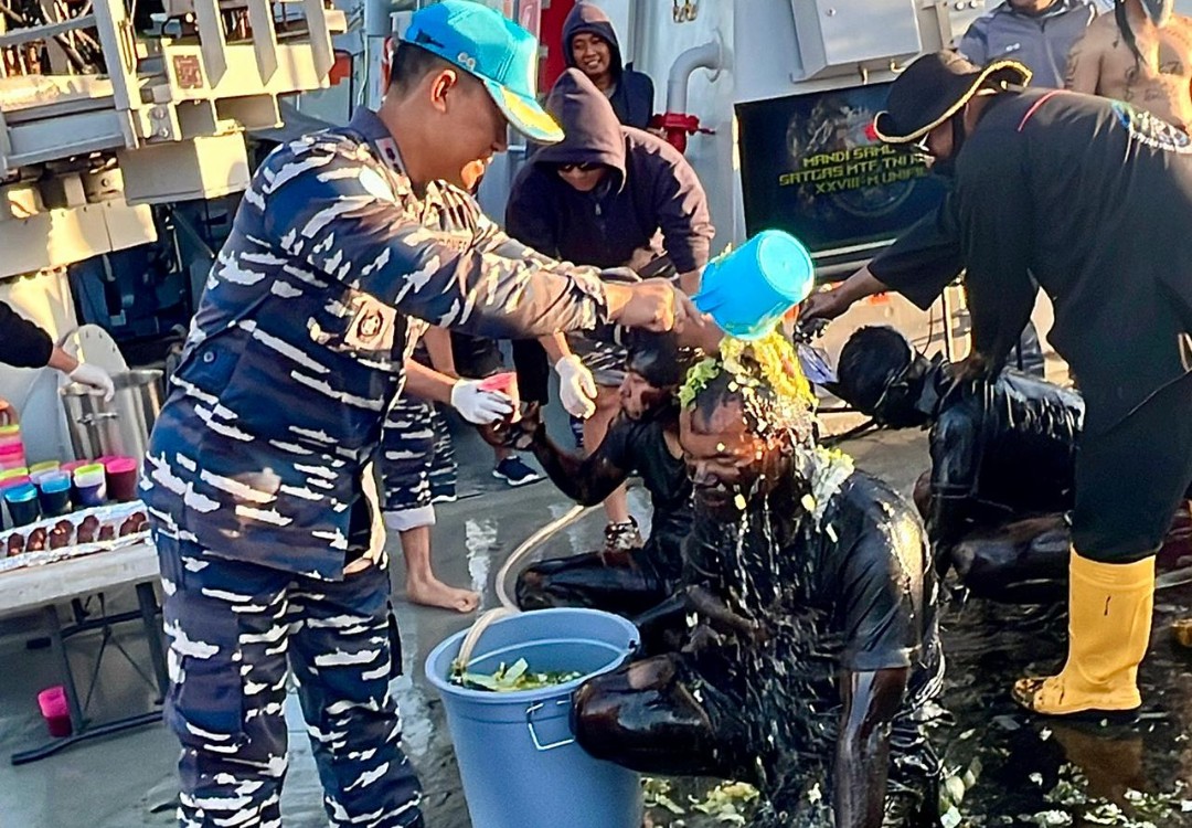 SURABAYATODAY.ID, SURABAYA – Para prajurit muda KRI Sultan Iskandar Muda-367 (KRI SIM-367) melaksanakan Mandi Khatulistiwa yang dikemas sebagai Mandi Samudera. Dalam kegiatan yang dipimpin Letkol Laut (P) Abdul Haris selaku Komandan Satgas (Dansatgas) MTF XXVIII-M/UNIFIL itu juga sebagai rangkaian kegiatan Pengangkatan Warga Baru Kapal Permukaan dan Upacara Penyematan Brevet Kapal Permukaan.