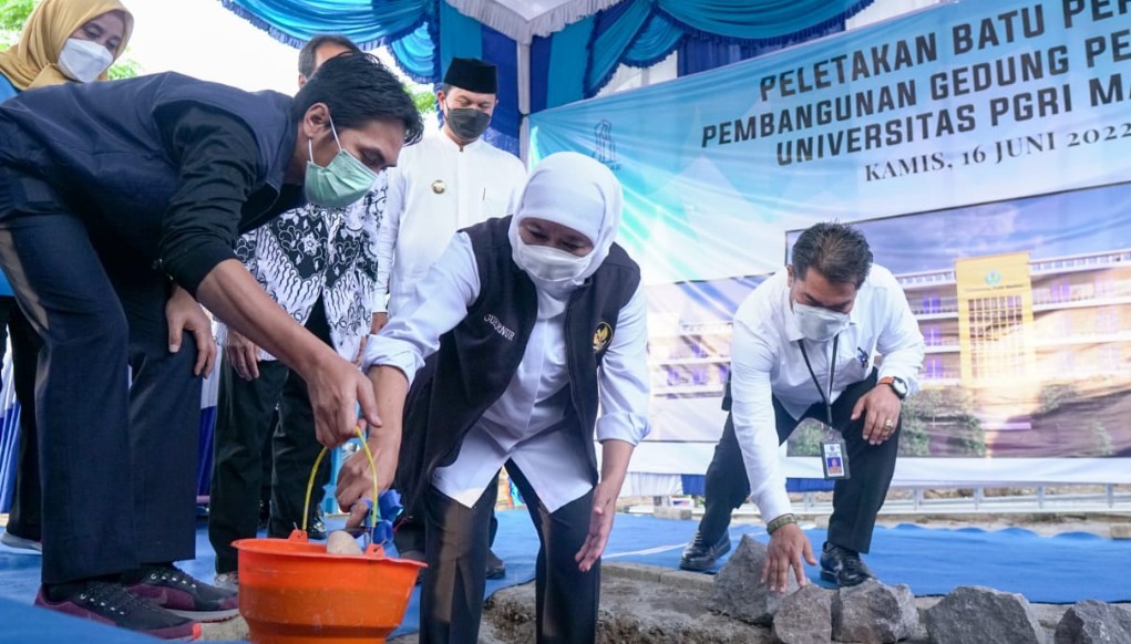 Sebagai penutup, Gubernur Khofifah melakukan peletakan batu pertama (Gedung Kuliah Terpadu) Universitas Persatuan Guru Republik Indonesia (PGRI) Madiun.