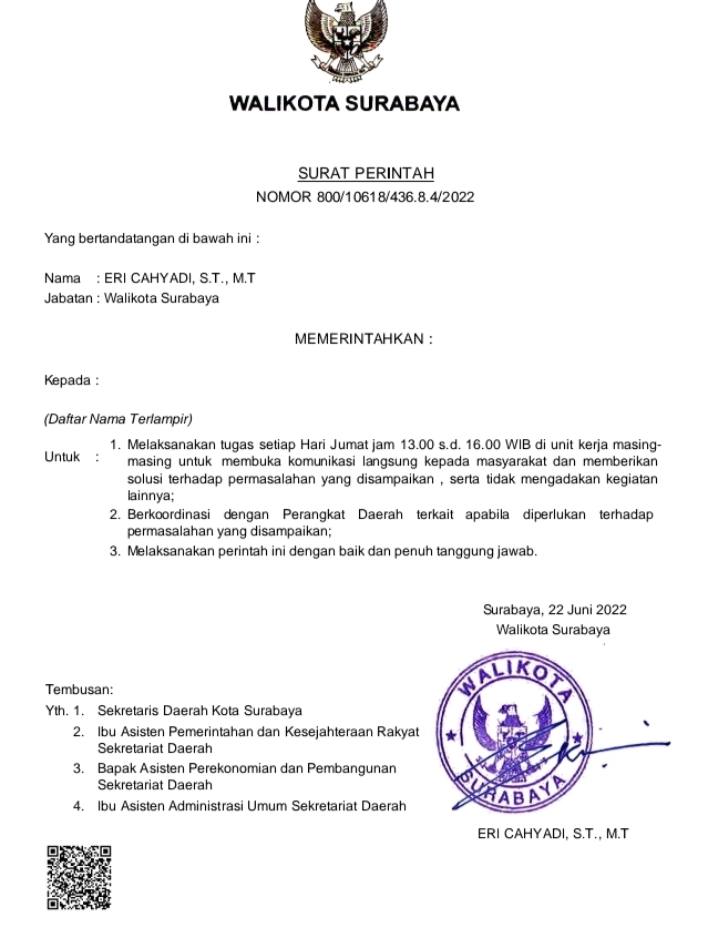 SURABAYATODAY.ID, SURABAYA – Wali Kota Surabaya Eri Cahyadi menerbitkan Surat Perintah Nomor 800/ 10618/ 436.8.4/ 2022 tertanggal 22 Juni 2022. Surat perintah itu berupa instruksi kepada seluruh kepala Perangkat Daerah (PD), camat dan lurah di lingkungan Pemkot Surabaya agar membuka komunikasi langsung dengan warga di masing-masing unit kerja.