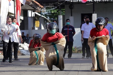 “Kami mengadakan aneka ragam lomba. Kemarin makan kerupuk dan hari ini balap karung,” kata Kepala Dinsos Kota Surabaya, Anna Fajriatin.