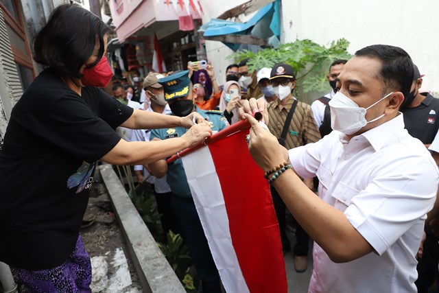 Wali Kota Surabaya Eri Cahyadi memasangkan bendera merah putih ke salah satu rumah warga di kawasan Tambaksari, Surabaya.