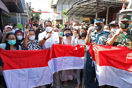 SURABAYATODAY.ID, SURABAYA – Menyambut HUT Kemerdekaan RI ke-77, Wali Kota Surabaya Eri Cahyadi bagi-bagi bendera merah putih ke rumah warga di kawasan Kecamatan Tambaksari, Rabu (10/8). Eri bersama rombongan masuk dari gang ke gang, mulai dari Jalan Tambaksari Selatan Gang 9 dan Gang 15, Jalan Jagiran 1 hingga ke Jagiran Makam.