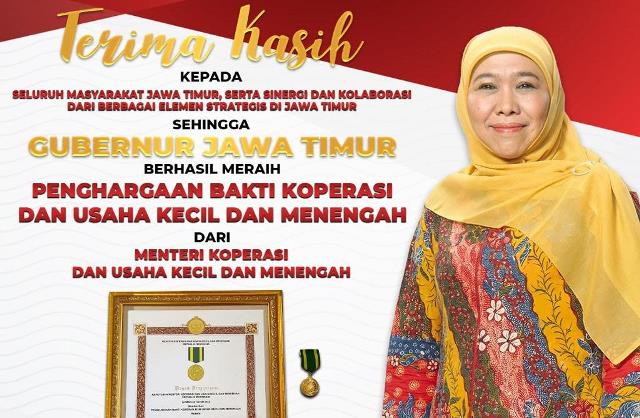 Tanda jasa itu merupakan penghargaan tertinggi yang diberikan oleh Menteri Koperasi dan UKM Republik Indonesia. Yang mana, diterima atas peran aktif Gubernur Khofifah dalam menyukseskan pembinaan dan pengembangan Koperasi dan UKM di Jawa Timur.