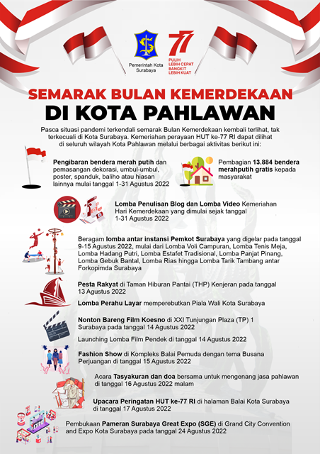 Republik Indonesia (RI) merayakan Hari Kemerdekaan ke-77. Dua tahun pandemi Covid-19 melanda, membuat perayaan kemerdekaan harus dilaksanakan secara terbatas. Tak terkecuali yang berlangsung di Kota Surabaya, Jawa Timur.